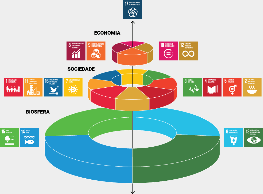 A Organização das Nações Unidas definiu um conjunto de parâmetros para a melhor adequação do funcionamento das sociedades atuais por meio do estabelecimento da Agenda 2030, na qual foram firmados os Objetivos do Desenvolvimento Sustentável (ODS), relacionados a três eixos práticos: a biosfera, a sociedade e a economia, conforme exposto na representação a seguir, extraída da página oficial do documento.