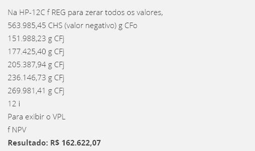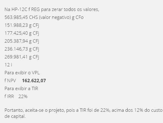 Vejamos, na tabela a seguir, o cálculo da TIR na HP12 com um custo de capital 12% para a
