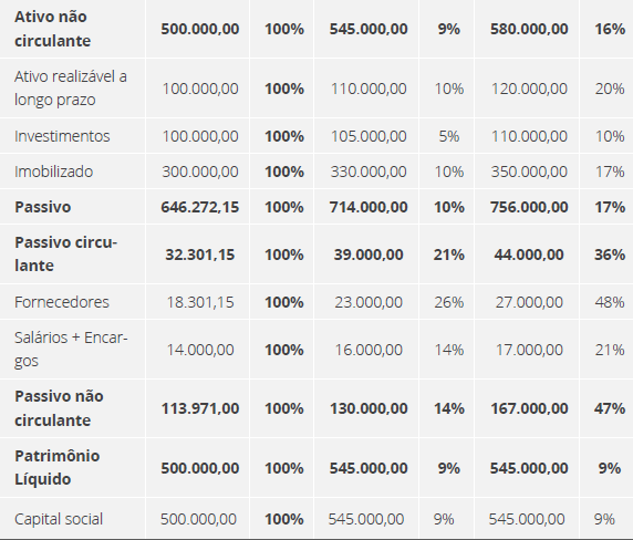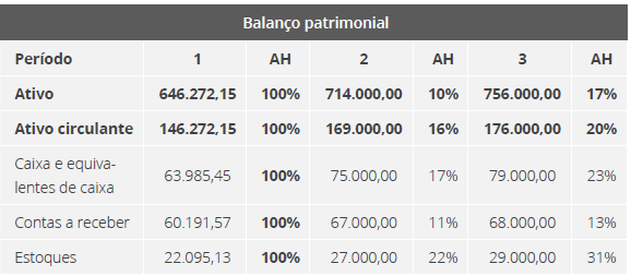 A análise horizontal não, somente, melhora a revisão direta da consistência de uma empresa ao longo do tempo, mas também melhora a comparabilidade do crescimento de uma empresa com o de seus concorrentes. Vejamos um exemplo, na tabela a seguir.