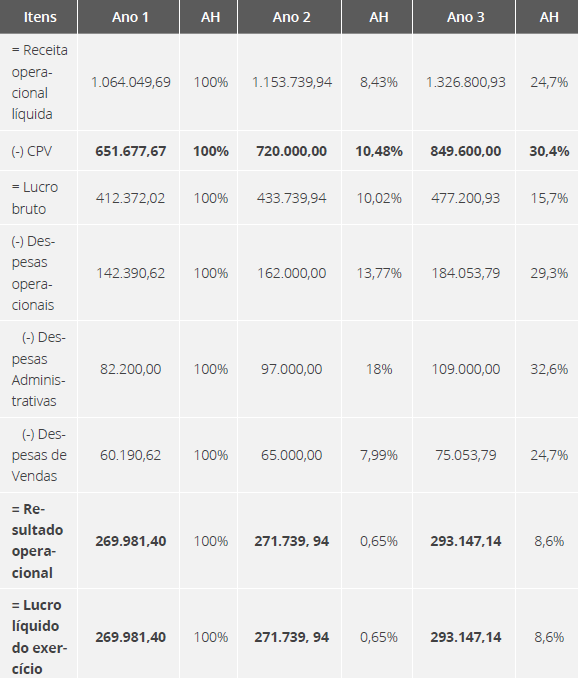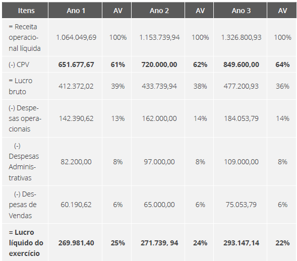 Os índices são calculados dividindo-se os valores de cada conta pelo valor das Receitas Líquidas de vendas do mesmo período e multiplicando-se por 100. Ao analisar a conta CPV no período “1”, por exemplo, dividese o valor R$ 651.677,67 por R$ 1.064.049,69 e multiplica-se por 100 e obtém-se o índice 61%. A análise vertical dá uma ideia de proporção. A conta CPV, por exemplo, mostra que os custos representaram 61% das vendas no período “1”, sendo alterados para 62% no período “2” e para 64% no período “3”. Já o lucro líquido representava 25% das vendas no período “1”, sendo reduzido para 24% e 22% nos períodos “2” e “3”, respectivamente.