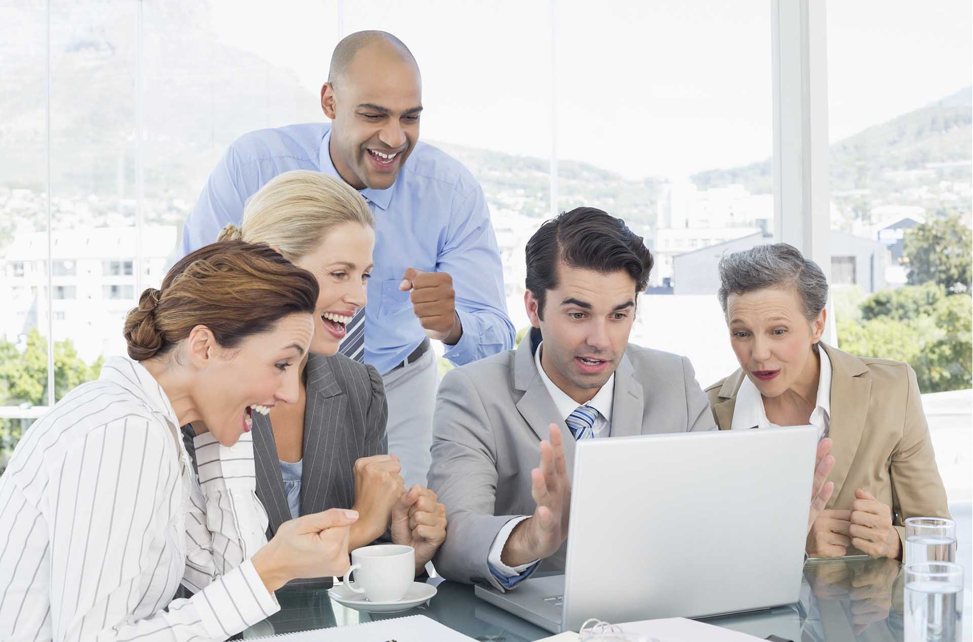 #PraCegoVer: A imagem mostra um grupo de cinco profissionais, visivelmente entusiasmados e celebrando enquanto olham para a tela de um laptop. Eles estão em um ambiente de escritório moderno com janelas grandes que oferecem uma vista clara do exterior. O grupo é diverso e inclui homens e mulheres de diferentes idades. Todos estão sorrindo e alguns fazem gestos de comemoração, como punhos cerrados de alegria. A cena transmite um forte sentimento de colaboração, satisfação e sucesso, sugerindo que a equipe alcançou um marco importante ou recebeu boas notícias sobre um projeto em que estão trabalhando.